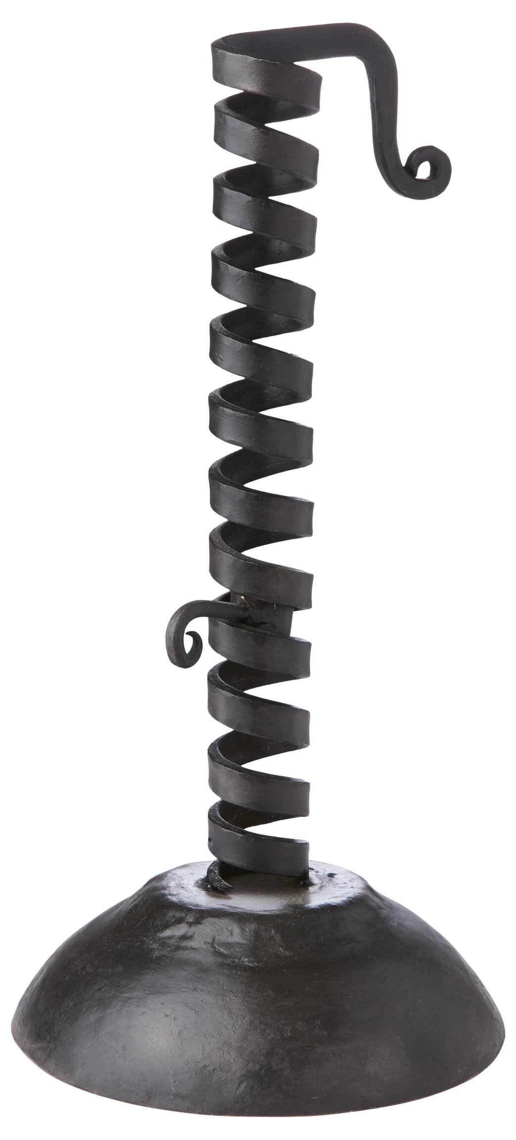 Basen är tung och stabil och ger hela produkten ett gediget intryck. Den är tillverkad i ett mörkt material, vilket harmoniserar med den spiralformade stången. Spiralens svarta färg och de oförädlade ytorna visar på en industriell och rustik inspiration, och materialet verkar vara metall, vilket ger en känsla av hantverk och tidlös hållbarhet.