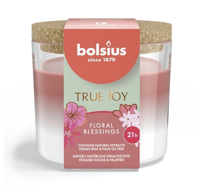 På bilden syns ett doftljus från Bolsius kollektion, som finns hos Ljuslyktor.nu. Ljuslyktan, under namnet bolsius Doftljus True Joy - Floral Blessings, utstrålar en harmonisk och inbjudande atmosfär. Dess design är genomtänkt och funktionell med en lyktbehållare av glas som ger en klar vy av det rosa vaxet som fyller den. Över ljuset finns ett tätslutande lock av kork, som inte bara är praktiskt för att bevara doften när ljuset inte används, utan också tillför en känsla av naturlighet och hållbarhet.