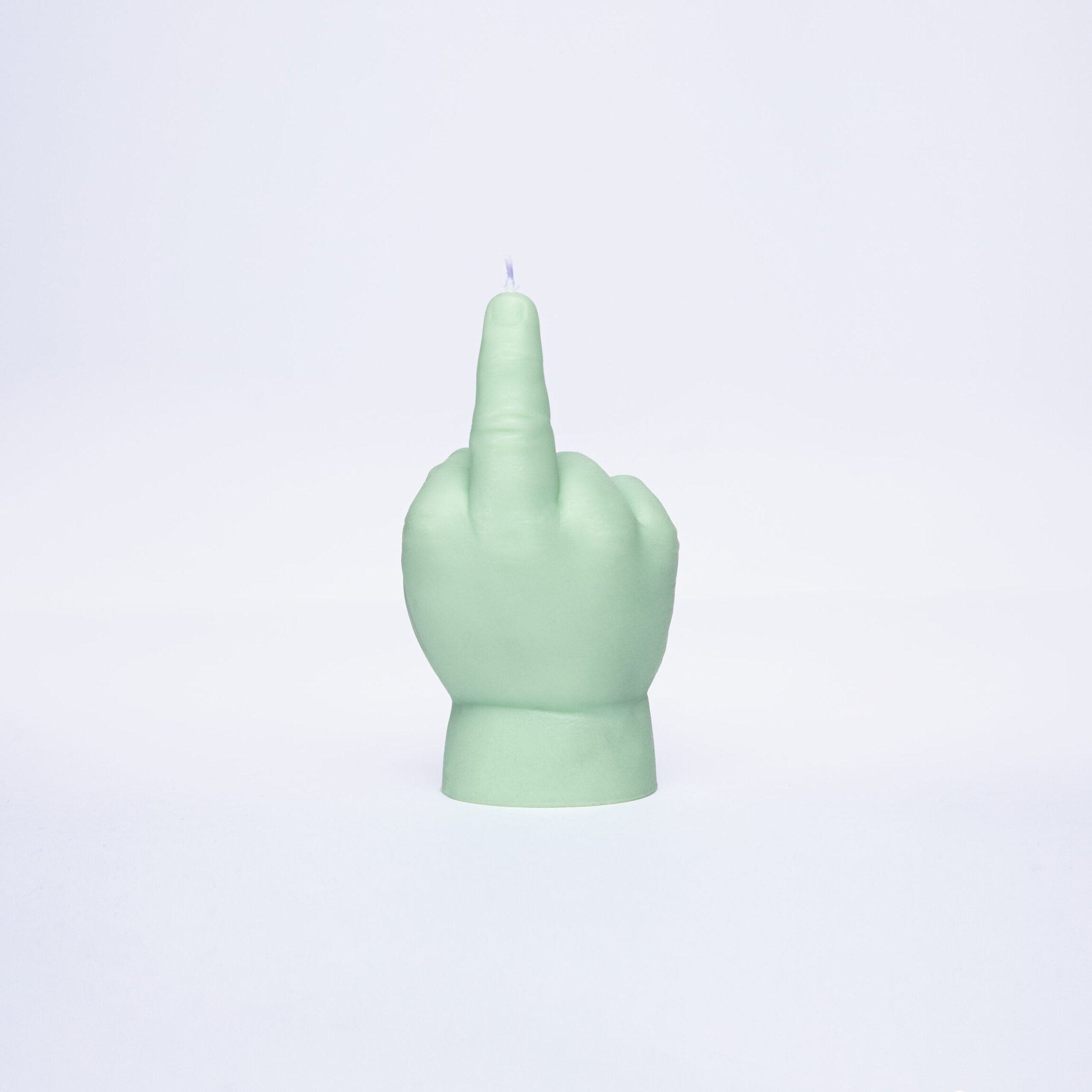 På bilden ser vi en handformad ljuslykta. Den är stiliserad som en babyhand och är färgad i en mild, grön nyans. Handen är formad för att visa ett uppsträckt långfinger, vilket ger en distinkt och humoristisk design. Överst på det uppsträckta fingret syns en vek, som ger intryck av att ljuset är redo att tändas.