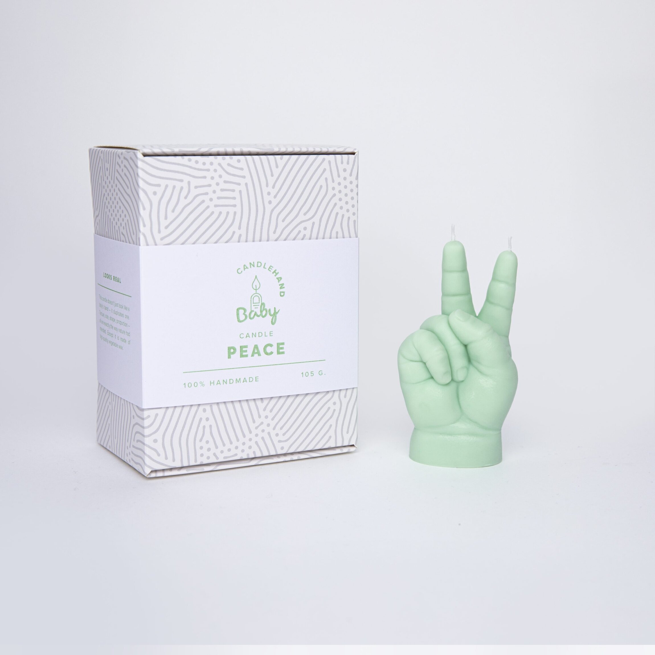 Bilden visar en fascinerande produkt från Ljuslyktor.nu, en butik som är känd för sitt breda sortiment av ljuslyktor med noggrant utvald design och ljuskvalitet. Produkterna härifrån är präglade av unika estetiska inslag, vilket även speglas i bilden av Candle Hand Baby Green - Peace från varumärket Candlehand.