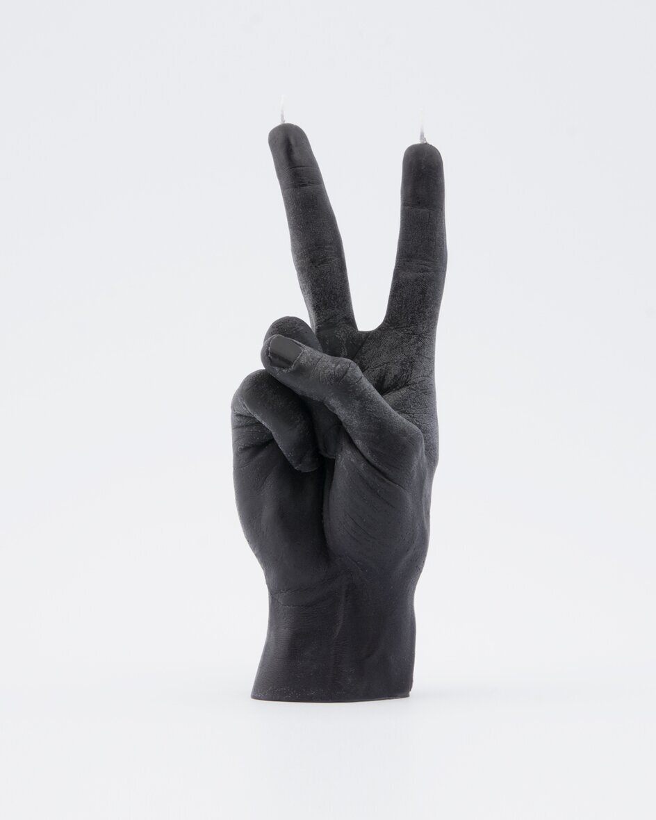 Bilden visar en unik ljuslykta från butiken Ljuslyktor.nu, som är känd för sitt breda sortiment av ljuslyktor med fokus på både design och ljuskvalitet. Produkten på bilden heter Candle Hand - Victory, och den är skapad av varumärket Candlehand. Denna speciella ljuslykta är formad som en hand som håller upp två fingrar i ett V-tecken, vilket ofta symboliserar seger eller fred.