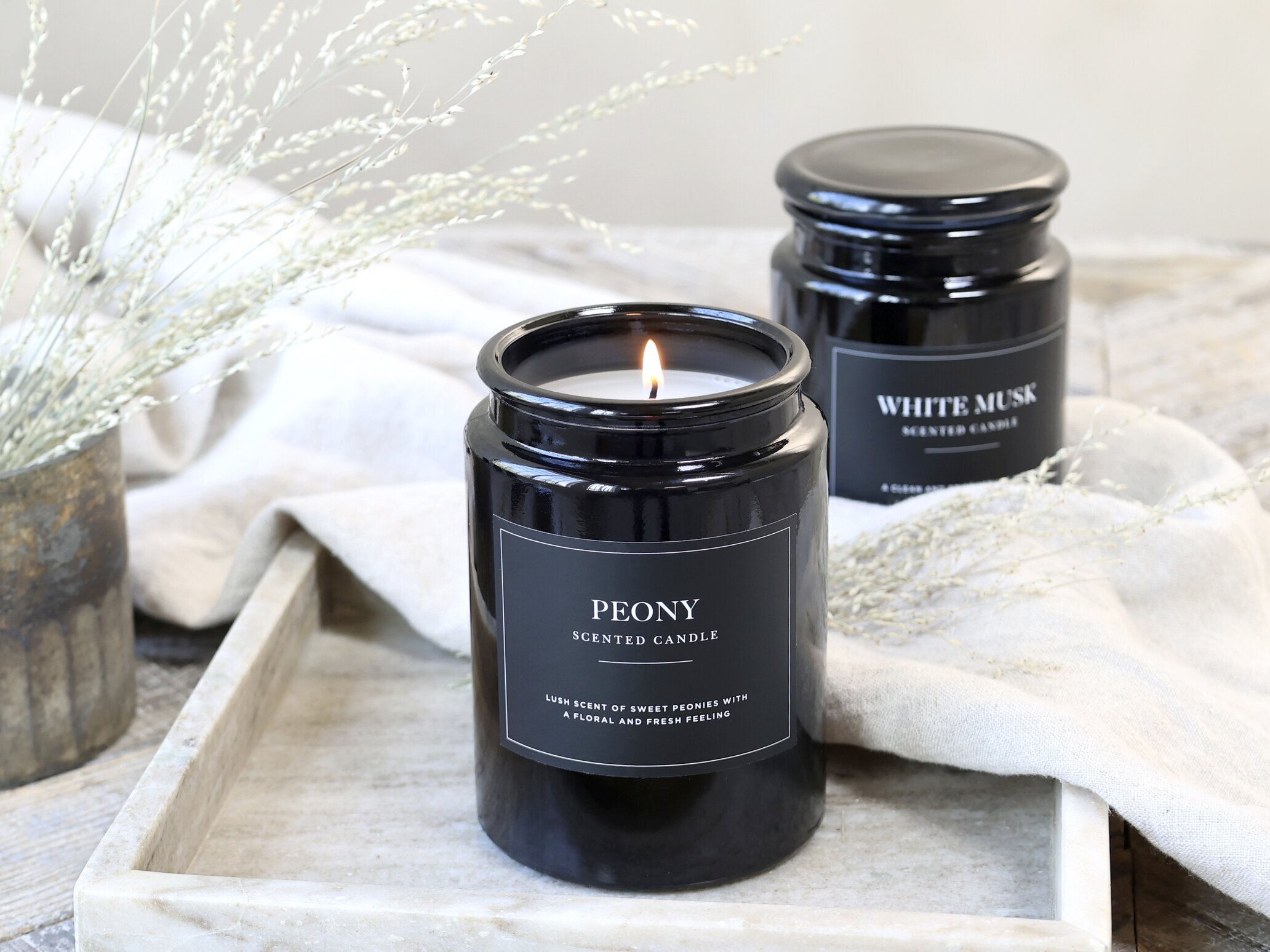 På etiketten står klart och tydligt produktens namn, Peony, följt av en beskrivning av doften. Den lilla texten betonar doftens karaktäristika och accentuerar produktens profil. Bredvid Peony-ljuset finns ytterligare ett doftljus, White Musk, också från Chic Antique. Denna andra behållare har en liknande design, vilket skapar en visuell enhetlighet i bilden.