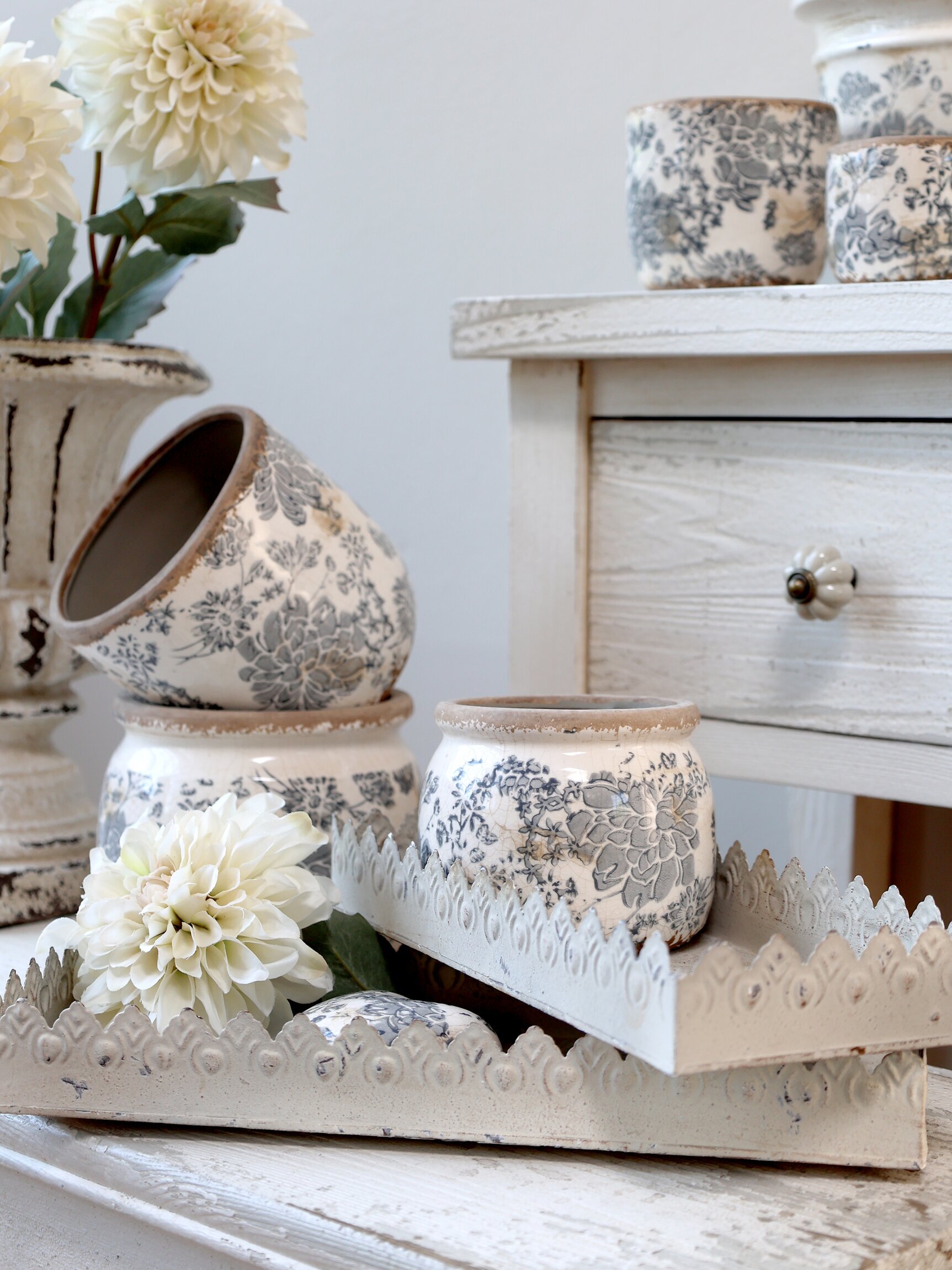 Bilden från Ljuslyktor.nu visar ett harmoniskt arrangerat stilleben med produkter från varumärket Chic Antique. I centrum av bilden syns setet med namnet Fat Med Mönster & Dekorkant Set/3, vilket inkluderar tre brickor med en detaljerad kant. Dessa brickor vilar på en vit patinerad yta, vilken utgör en del av en möbel med en vintage karaktär. Den ljusa färgskalan i bilden förstärker den gammaldags och lugna känslan.