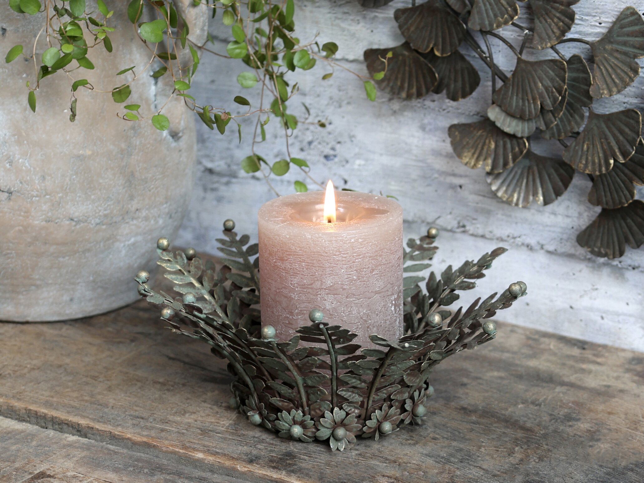 Bilden från Ljuslyktor.nu visar en noggrant komponerad scen med fokus på produkten från varumärket Chic Antique, kallad Ljusfat Med Bladdekor. I centrum av bilden står ett robust, beige blockljus vars yta bär en subtil struktur, vilket skapar en intressant yta när stearinljuset är tänt. Ljuset står placerat på ett detaljrikt ljusfat som pryds av utsökt utformade blader. Dessa blader sträcker sig uppåt med små kulor som dekorerar spetsarna, vilket förstärker den naturinspirerade känslan.