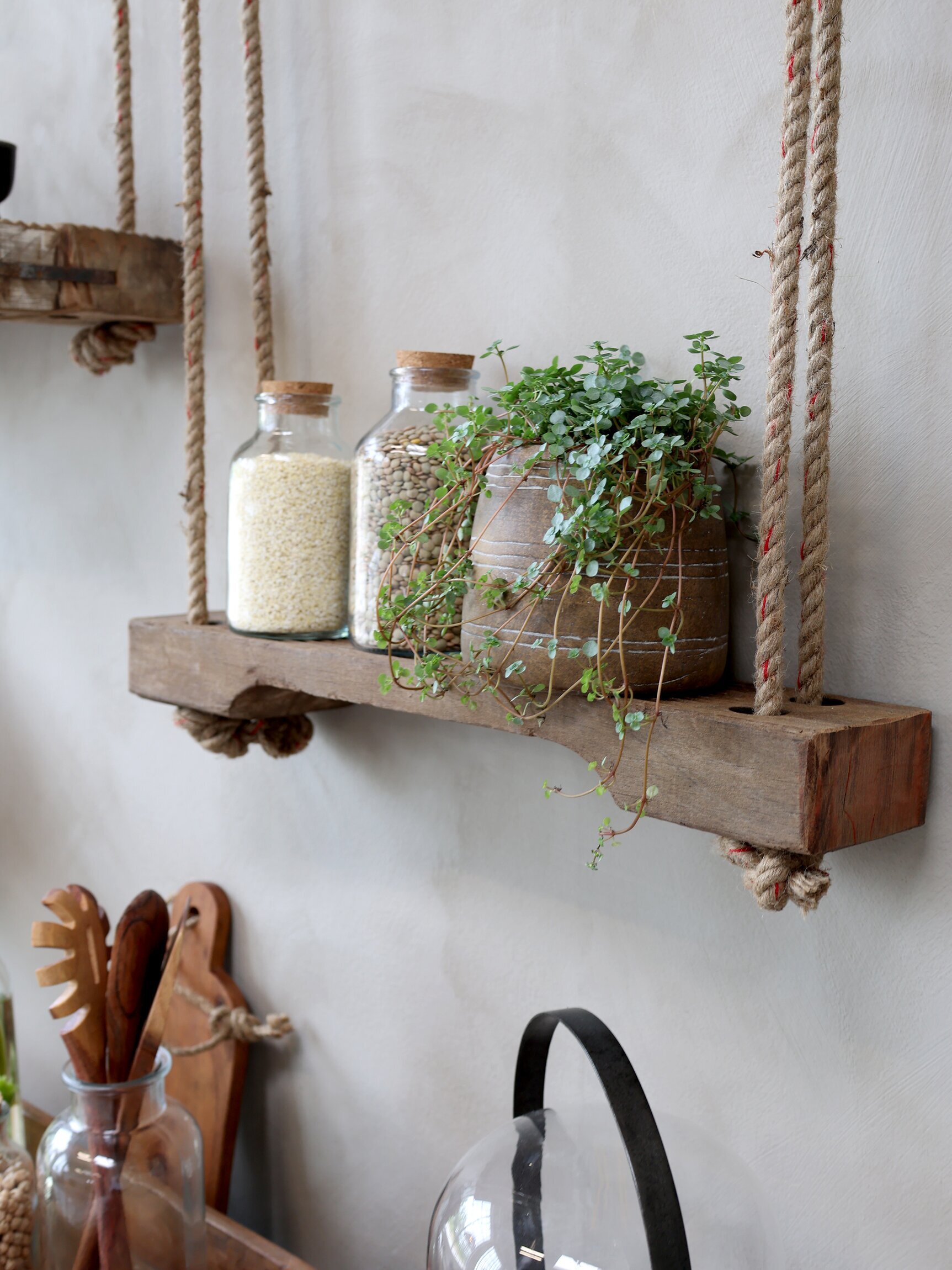Bilden visar en stilfull inredning från butiken Ljuslyktor.nu, där den uppmärksammade hyllan, Grimaud Med Jutesnöre L, från Chic Antique står i fokus. Hyllan är elegant uppsatt mot en ljus, krämfärgad vägg som ger en neutral bakgrund och framhäver de naturliga materialen. Själva hyllan är tillverkad av robust trä och hänger smidigt i tjockt jutesnöre, vilket skapar en rustik och jordnära atmosfär. Jutesnörena är knutna i stora, distinkta knutar som tillför en extra funktionell och visuell detalj.