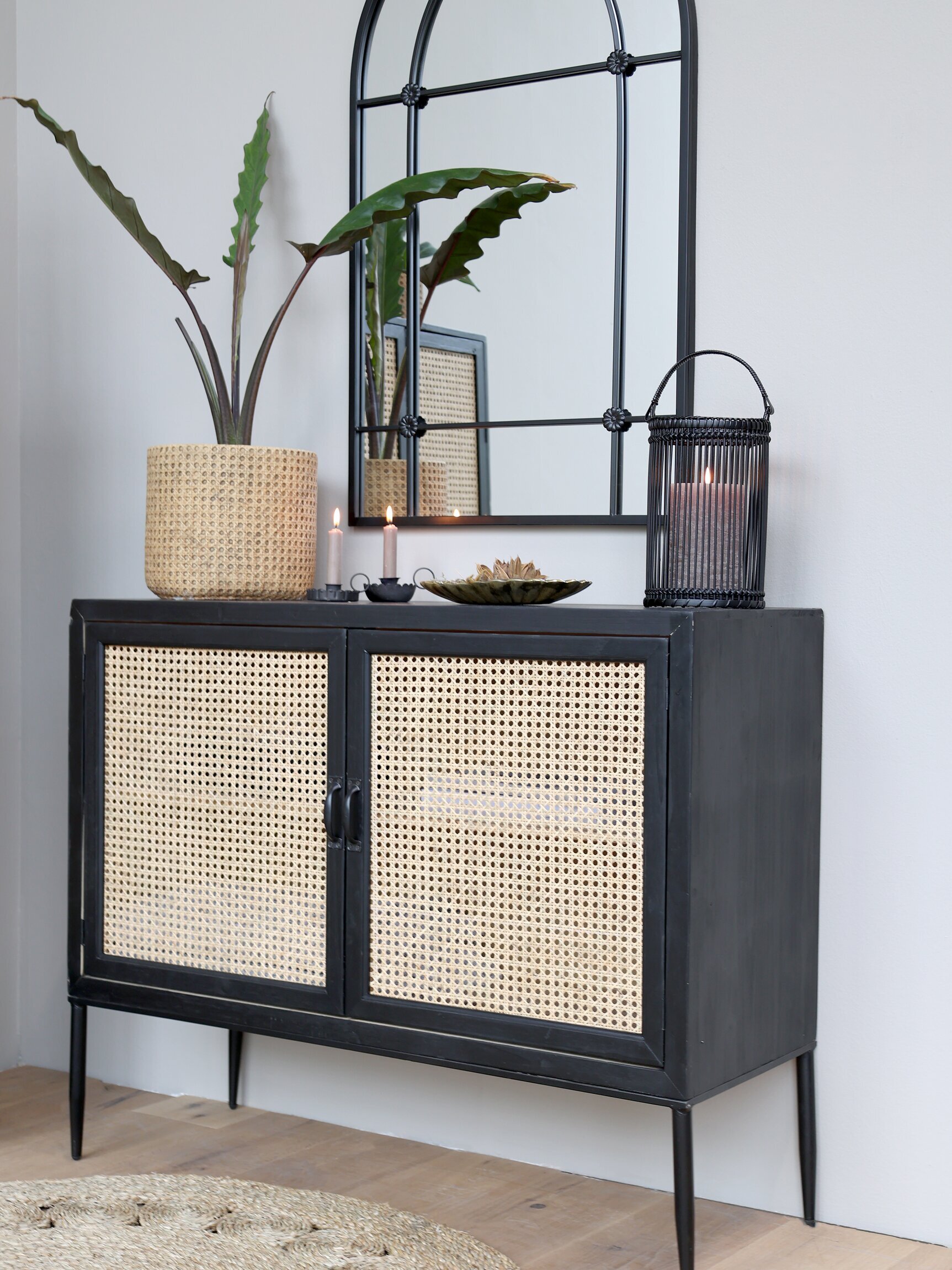 Bilden visar en stilfull och inbjudande inredningsmiljö från Ljuslyktor.nu, med fokus på produkten Lanterna Bambu Small från Chic Antique. På bilden finns ett smakfullt arrangerat utrymme med en svart byrå, vars dörrar är dekorerade med ljus rotting. Denna kontrast mellan mörkt trä och naturlig rotting ger en känsla av textur och djup.