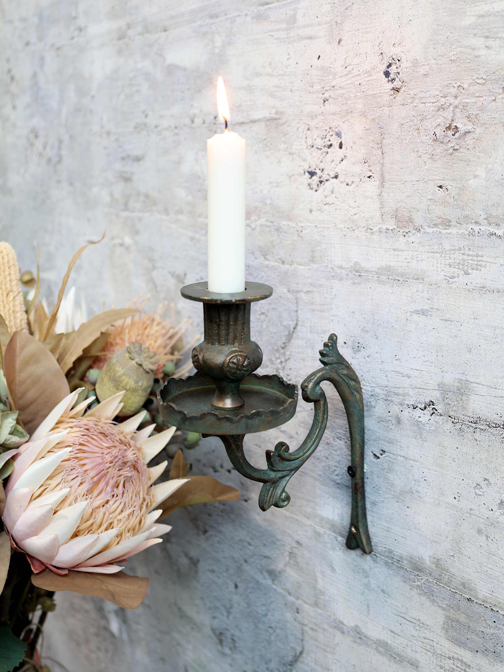 Bilden visar en atmosfärisk miljö skapad genom en ljusstake i antik mässing från varumärket Chic Antique, presenterad av butiken Ljuslyktor.nu. Ljusstaken, med sitt franska antika utseende, verkar vara noggrant utformad för att spegla en historisk charm och är fastsatt på en enkel kalkad vägg, vilket förstärker dess tidlösa känsla. Den robusta mässingsytan visar subtila mönster och dekorativa detaljer, typiska för en design med vintage-inspiration.