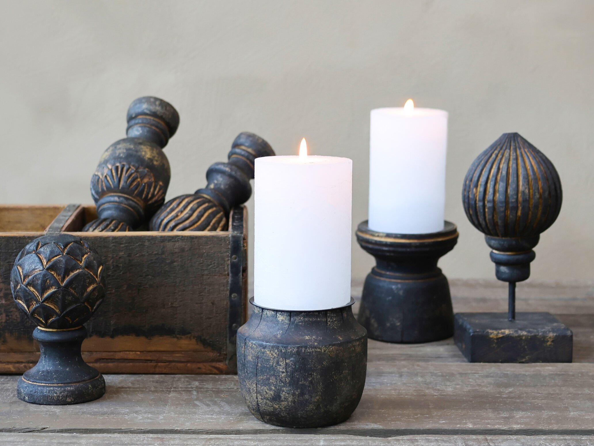 Till vänster om ljusstaken finns en trälåda fylld med dekorativa knoppar, också i antikbrun stil, som delar ljusstakens distinkta färg och textur. Denna låda ger en känsla av att vara välanvänd och accentuerar den rustika estetiken ytterligare. Knopparna har varierande mönster, några med skulpterade detaljer och andra med mer subtila ränder, vilket ger djup och variation till kompositionen.