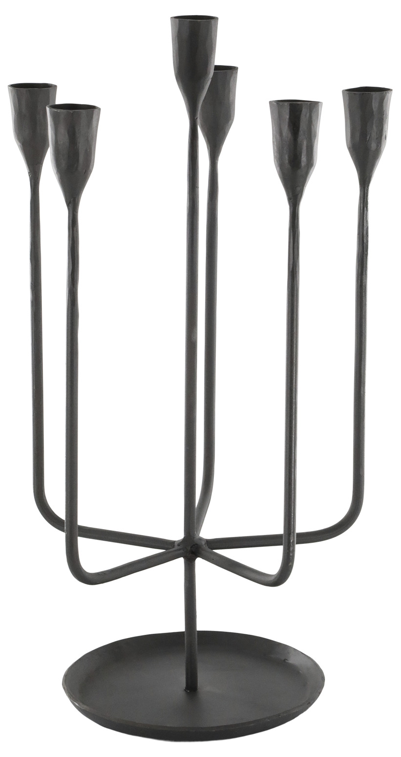 Ge ditt hem en varm och inbjudande känsla med denna vackra ljusstake i svart smide. Den har plats för sex ljus och blir en naturlig samlingspunkt på matbordet, i vardagsrummet eller på sideboardet. Den stilrena designen kombinerar klassisk elegans med rustik charm och passar lika bra till vardags som till festliga middagar.
