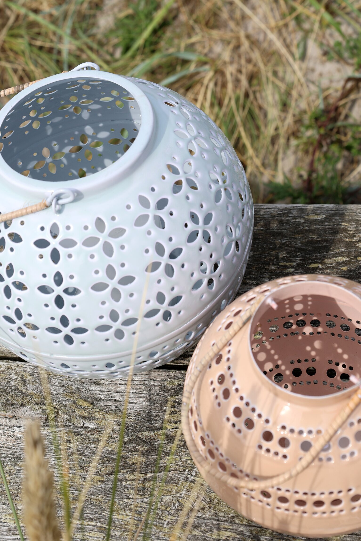 En stilren ljuslykta i emalj med dekorativa perforeringar som sprider ett mjukt och stämningsfullt ljus. Det praktiska handtaget gör den enkel att flytta och placera – perfekt för både bord, fönster eller uteplats.