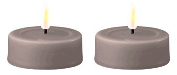 Bilden visar två LED-värmeljus från Deluxe Homeart, som erbjuds av Ljuslyktor.nu. Dessa värmeljus är gråa till färgen och säljs i ett praktiskt tvåpack, vilket gör dem lättillgängliga för dem som söker stilren belysning. De är runda och har en jämn, slät yta utan synliga strukturvariationer, vilket bidrar till deras moderna och minimalistiska utseende.