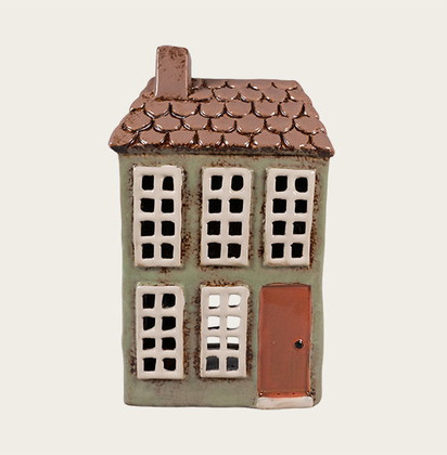 Charmigt keramikhus som med sin gröna fasad, bruna tak och fina fönster sprider ett mjukt, varmt sken när du tänder ett värmeljus inuti – perfekt för mysiga kvällar och en ombonad känsla i hemmet.