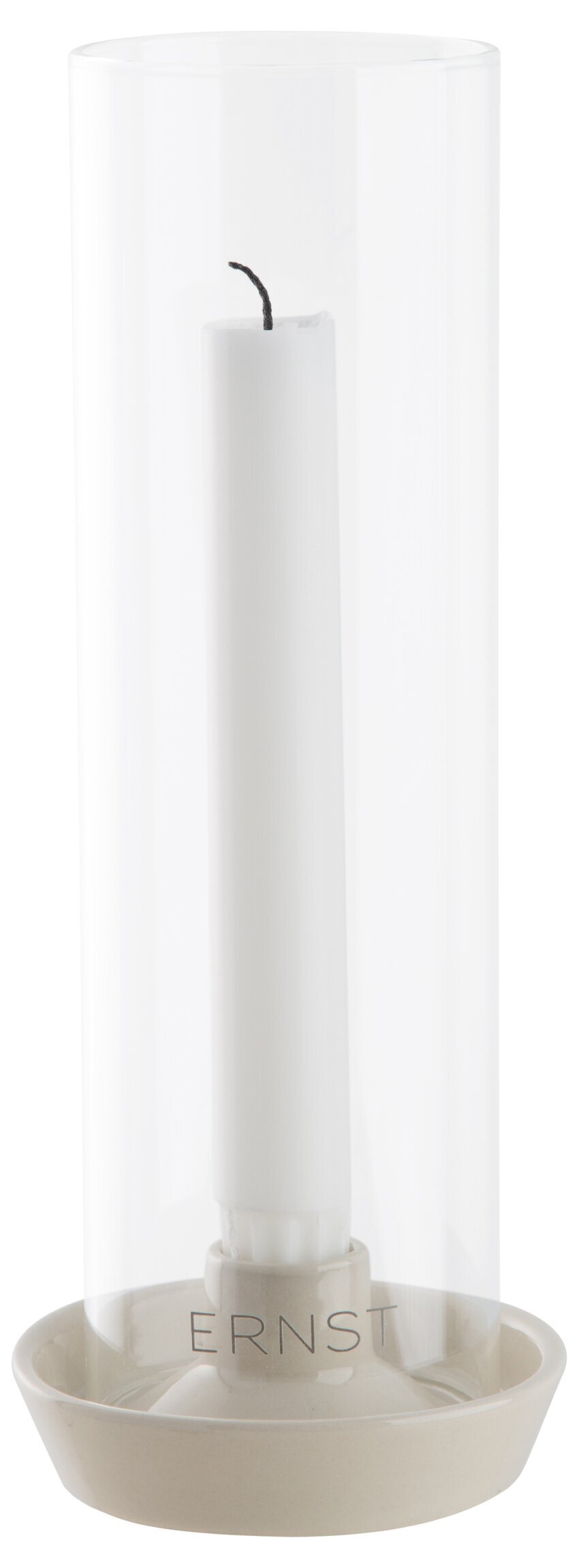 Basen av ljusstaken, tillverkad av stengods, har en mjuk vit nyans. Denna bas är rund med något upphöjda kanter, vilka ger ett diskret men fast stöd till glasbehållaren. Stengodset har en glaserad yta som skapar en subtil reflex vid ljusinsläpp. Namnet Ernst pryder basen och är diskret ingraverat på stengodsets yta, vilket ger en aning om det varumärke som står bakom designen.