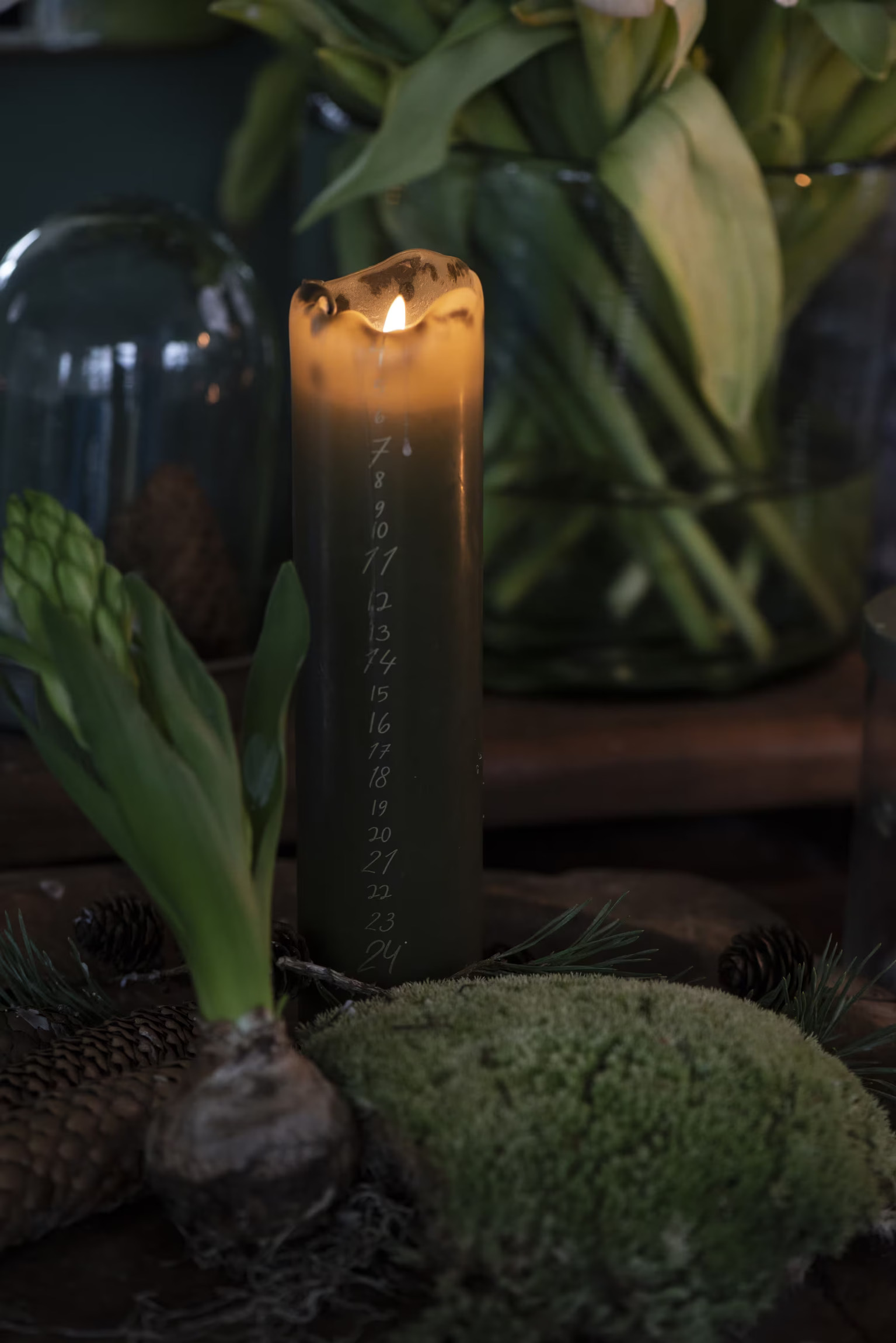 Kalenderljus 1-24 i en fin grön nyans med guldtext, en fin detalj som hjälper till att räkna dagarna till jul. Läs mer
