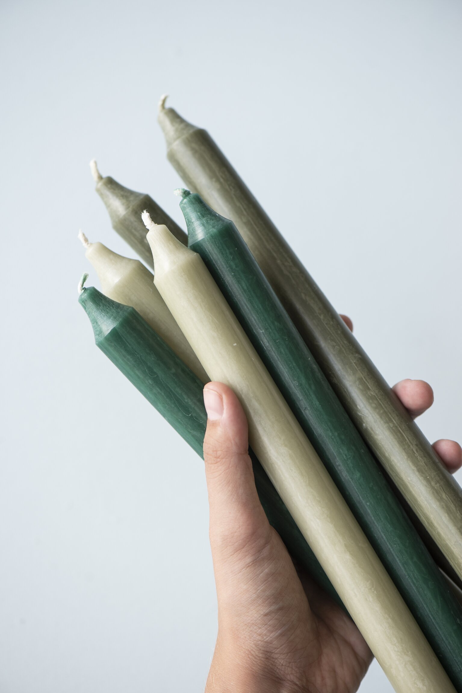 Det finns två dominanta färger på dessa kronljus. Tre av dem har en djup, olivgrön ton som ger ett naturligt intryck och kompletteras av sin rustika textur. Resten av ljusen visar upp en ljusare, nästan vitaktig färg som kan beskrivas som lingrå. Denna varierade färgpalett ger ett subtilt men tilltalande visuellt spel mellan de olika ljusens nyanser.