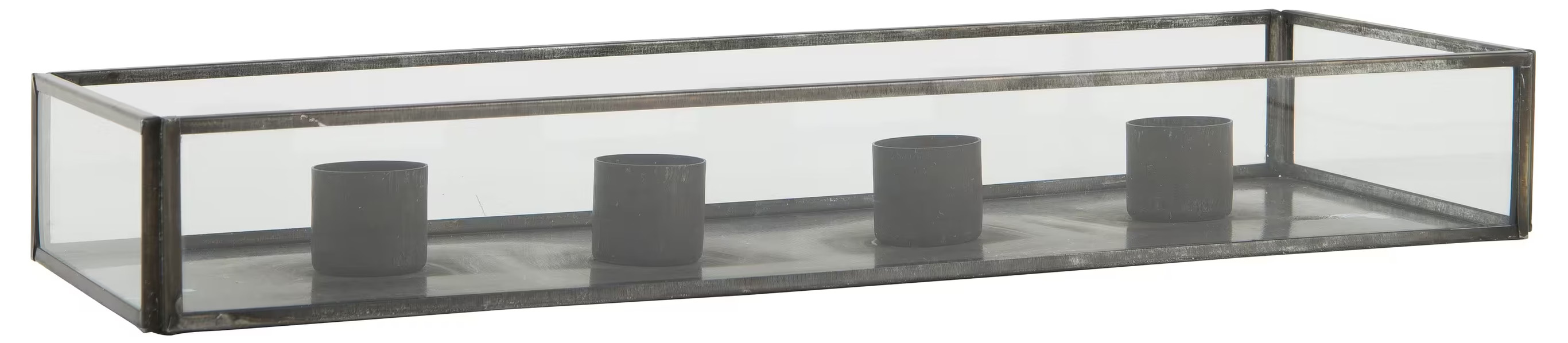 Glasets transparens ger inblick i ljusstakens inre, där fyra cylindriska hållare är placerade i jämna mellanrum längs botten. Dessa hållare är tillverkade av samma robusta metall som ramen, vilket skapar en harmonisk enhetlighet i designen. Metallens yta har en diskret, borstad finish som förstärker den industriella känslan.