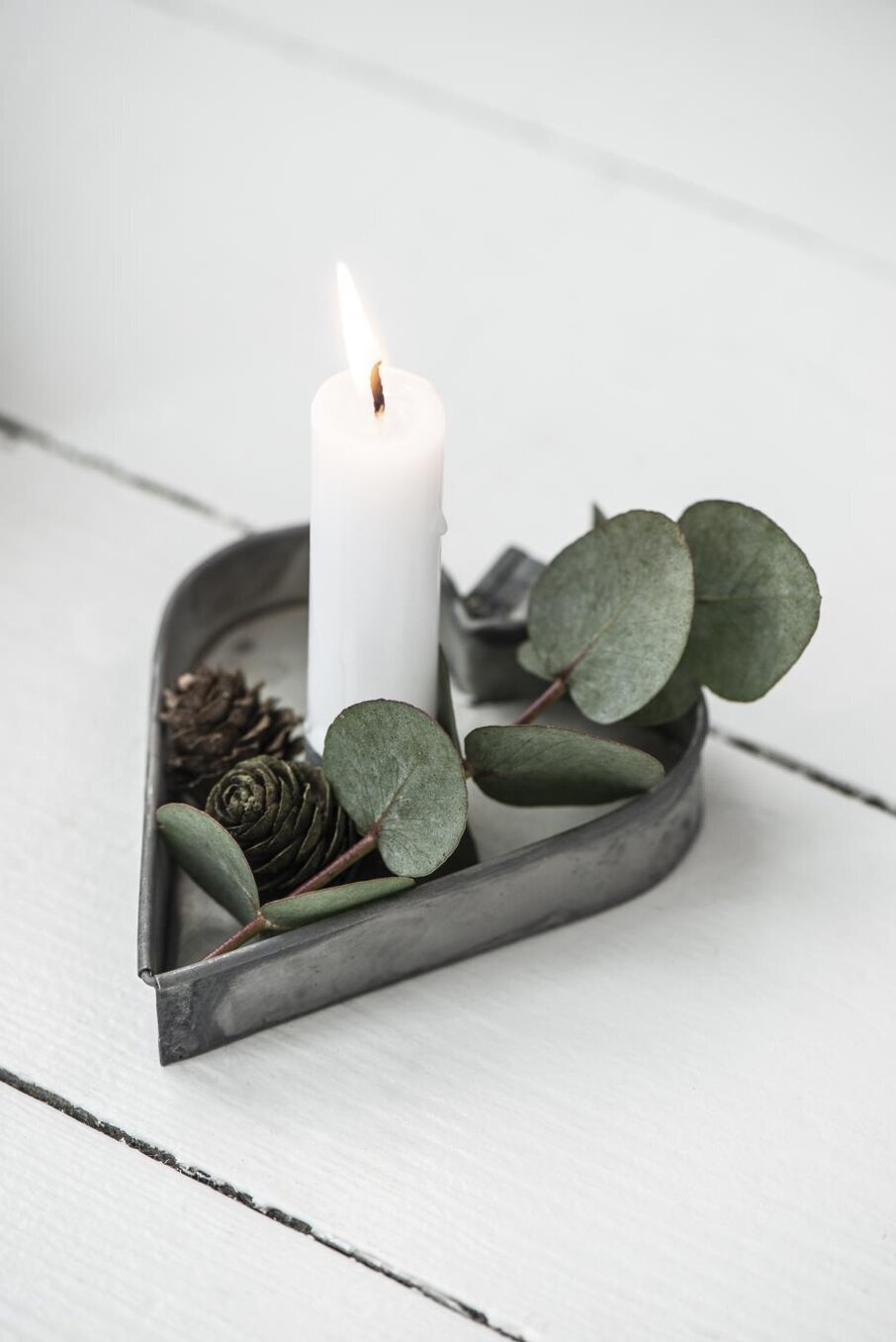 Hjärtformad ljusstake i zink med hållare för stearinljus. Fin att dekorera inför julen med mossa & eucalyptus.