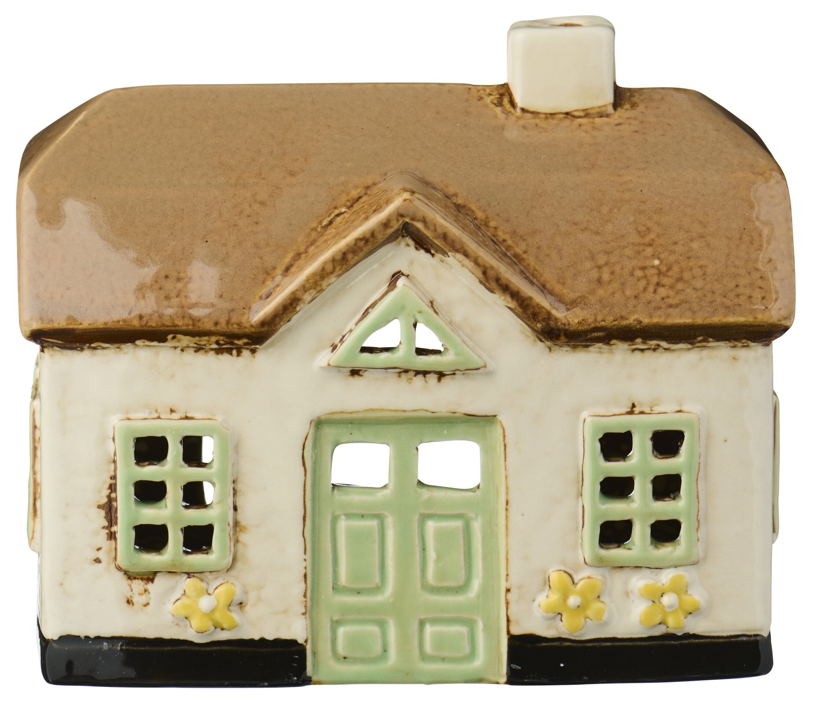 En söt och tidlös ljuslykta i form av ett litet hus, med mjuka naturfärger och charmiga detaljer som gröna dörrar, fönster och små blommor. När ljuset tänds silas ett varmt sken ut genom fönstren och skapar en lugn och hemtrevlig atmosfär.