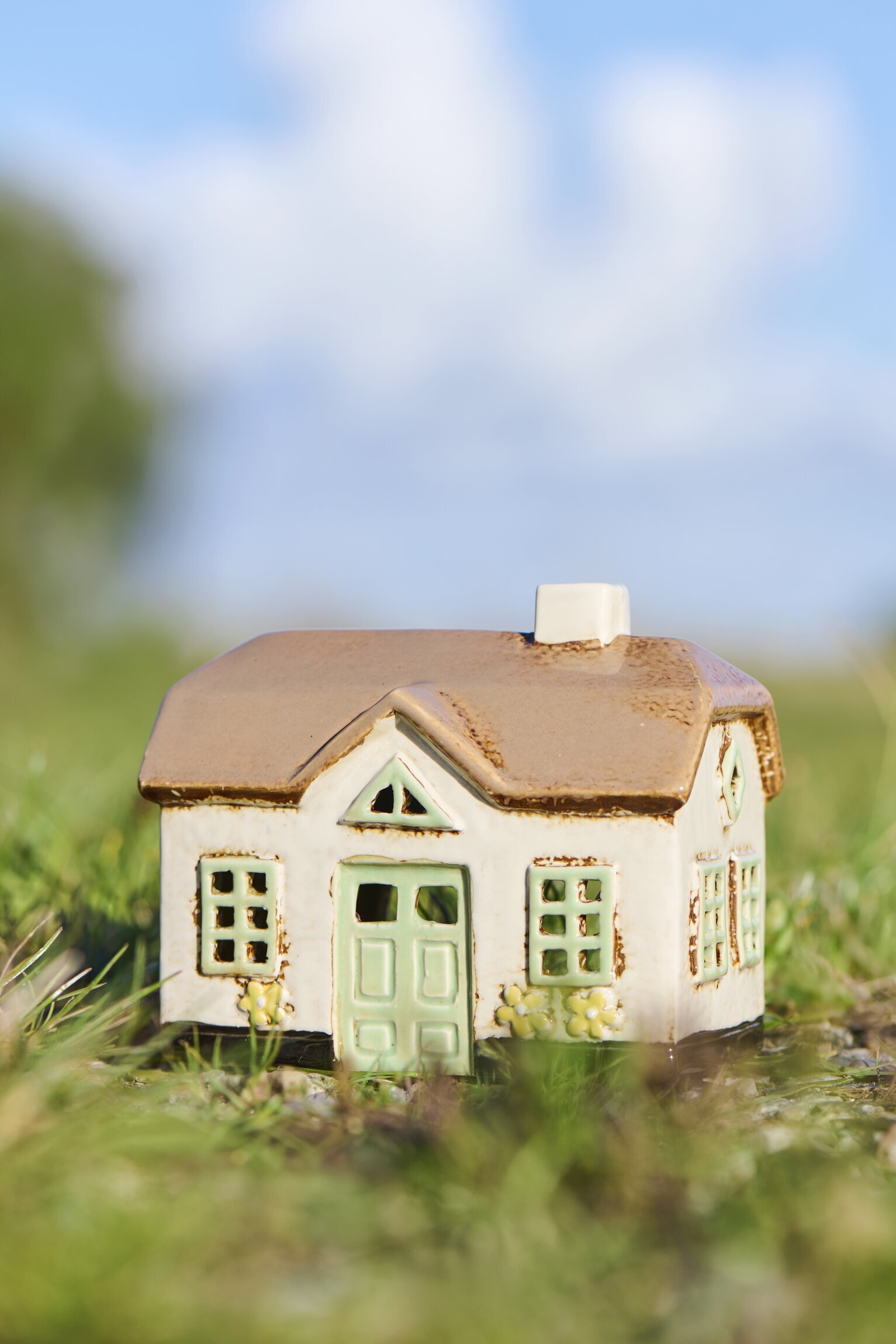 En söt och tidlös ljuslykta i form av ett litet hus, med mjuka naturfärger och charmiga detaljer som gröna dörrar, fönster och små blommor. Läs mer