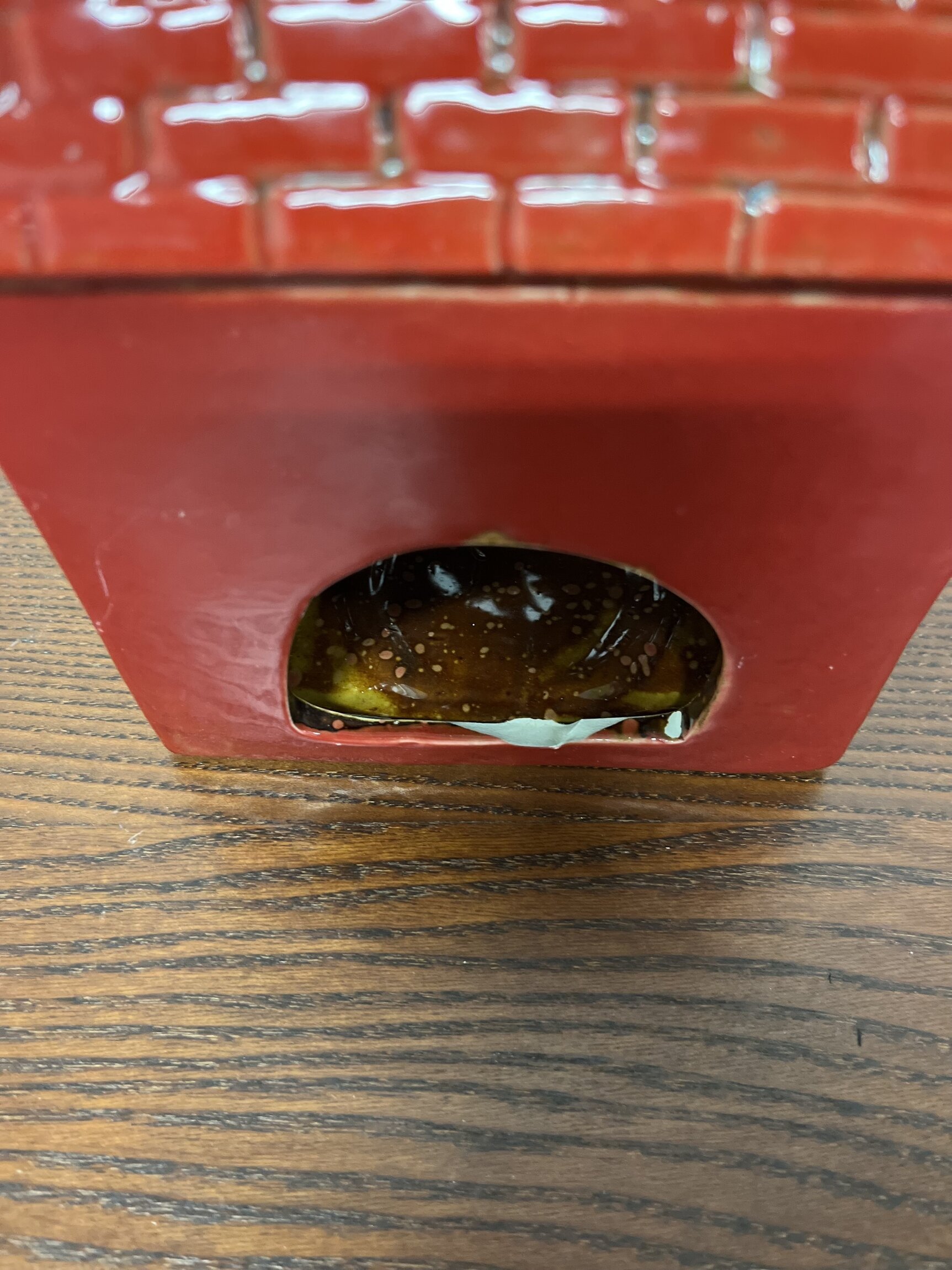 Ljuslyktan har en tydlig skada på baksidan, där en större flisa har gått av vid öppningen.