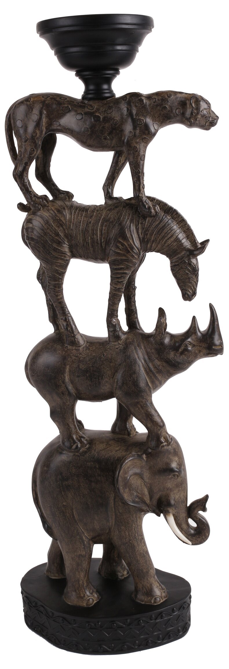Överst på toppen av denna fascinerande skulptur står själva ljushållaren, vars skålform är designad för att rymma ett levande ljus eller kanske en dekorativ LED-lampa. Ljushållaren har en klassisk formgivning, med linjer och bladverk i relief som kompletterar de naturliga formerna av djuren nedanför.