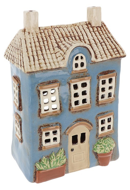 Dekorativ ljuslykta i form av ett charmigt blått hus, tillverkad i keramik med fina detaljer som rutiga fönster, takpannor och små krukor vid entrén. När du placerar ett värmeljus inuti lyser huset upp och ger ett mjukt och behagligt sken.
