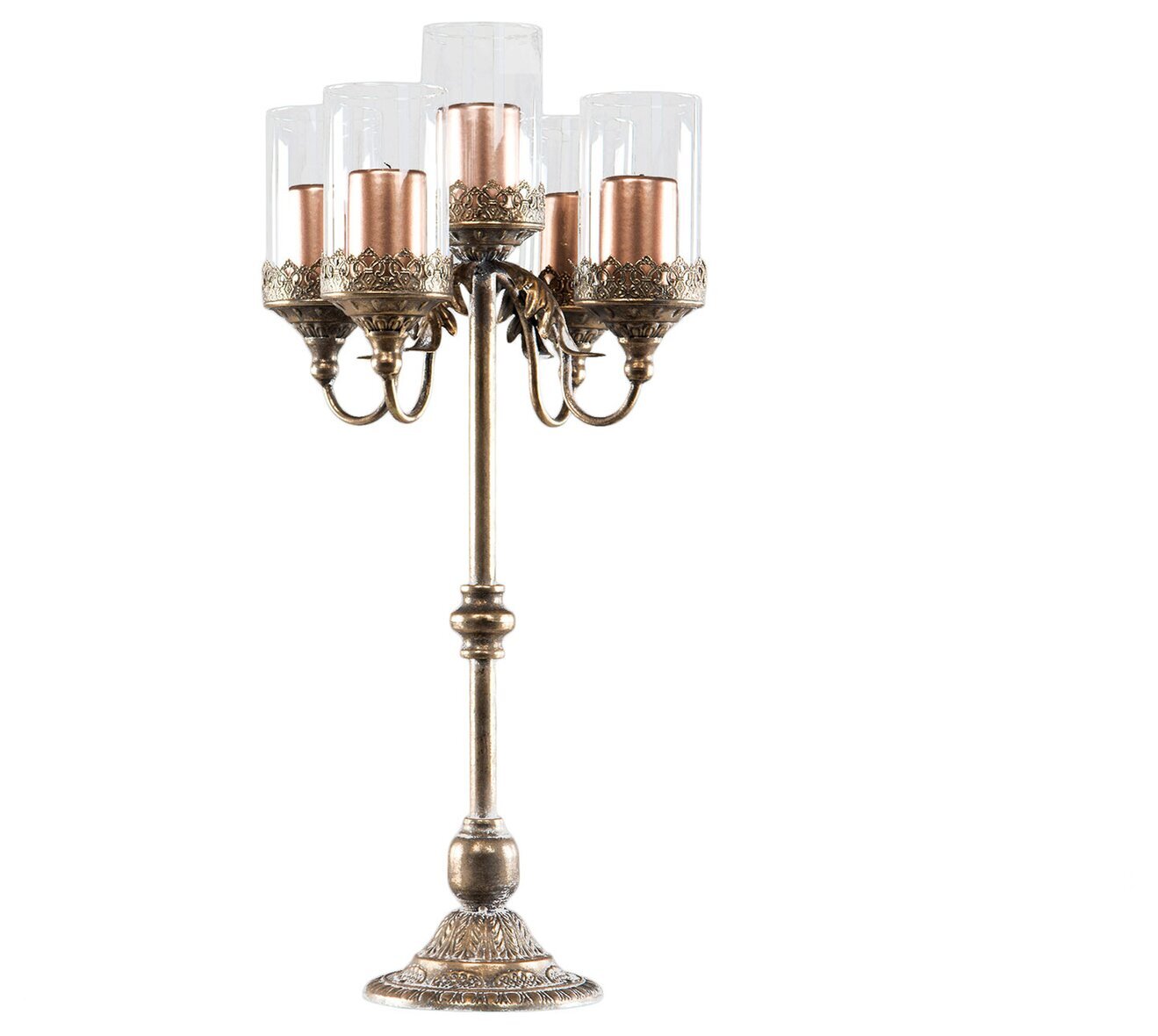 På bilden syns en kandelaber med fem armar från varumärket A Lot Decoration, en produkt som finns hos Ljuslyktor.nu – en butik specialiserad på dekorativa ljuslyktor och ljushållare med stor bredd inom design och ljuskvalitet. Modellen har en kraftig fot som ger stadga och är dekorerad med ett gediget mönster. Foten är detaljerad med snirkliga, ornamentala reliefer längs kanten, vilket tydligt framträder mot den släta, metalliska ytan i en mörkbrun nyans med inslag av antikmässing.