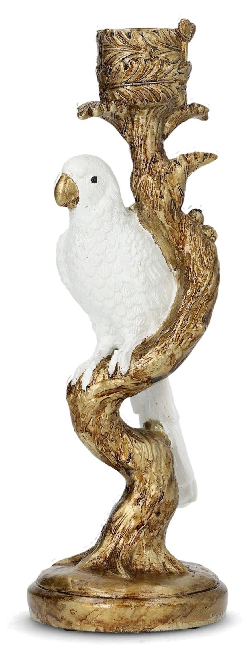 En elegant ljusstake där en vit kakadua sitter stolt på en slingrande gren i antikguld. Kombinationen av den mjukt vita fågeln och den varma guldfärgen skapar ett harmoniskt och exklusivt uttryck.