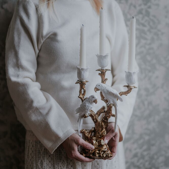 En pampig och dekorativ ljusstake där två vita kakaduor sitter på en detaljrik gren i antikguld. Läs mer