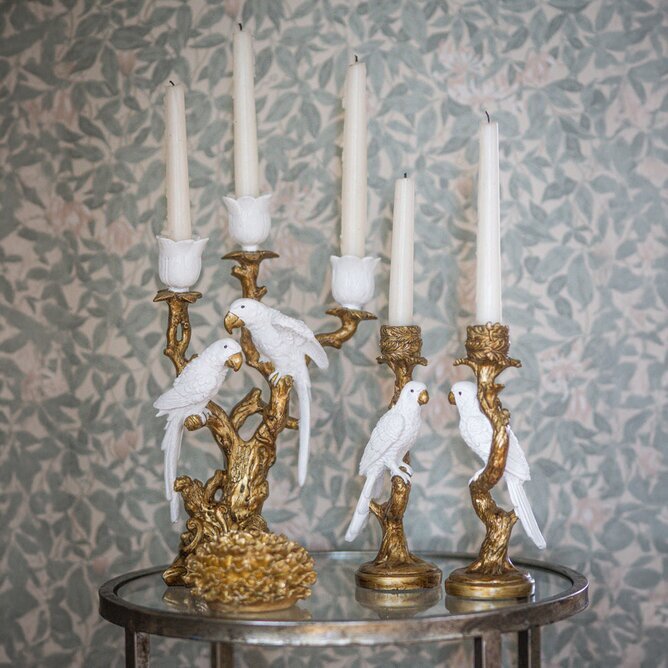 En pampig och dekorativ ljusstake där två vita kakaduor sitter på en detaljrik gren i antikguld. De tulpanformade ljushållarna ger ett mjukt och elegant uttryck som passar lika fint på matbordet som på ett sideboard.
