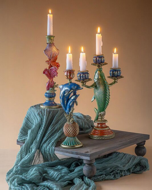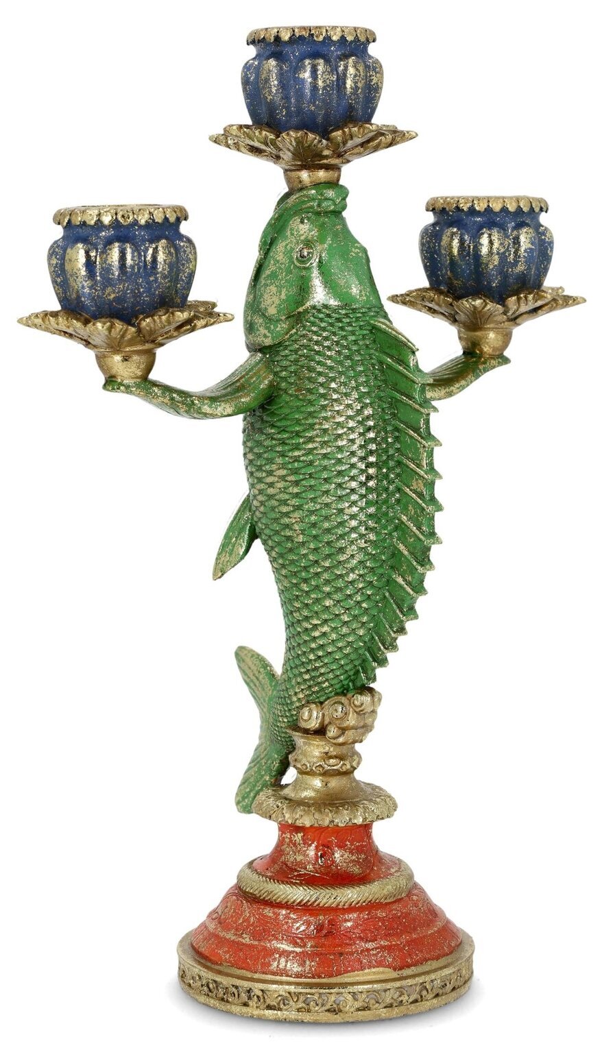 Låt inredningen få en tydlig wow-känsla med denna unika ljusstake formad som en detaljrik fisk. Med tre ljushållare och en vacker mix av grönt, blått och varma gulddetaljer blir den en dekorativ mittpunkt – perfekt för festdukningen eller som ett konstnärligt inslag i vardagsrummet.