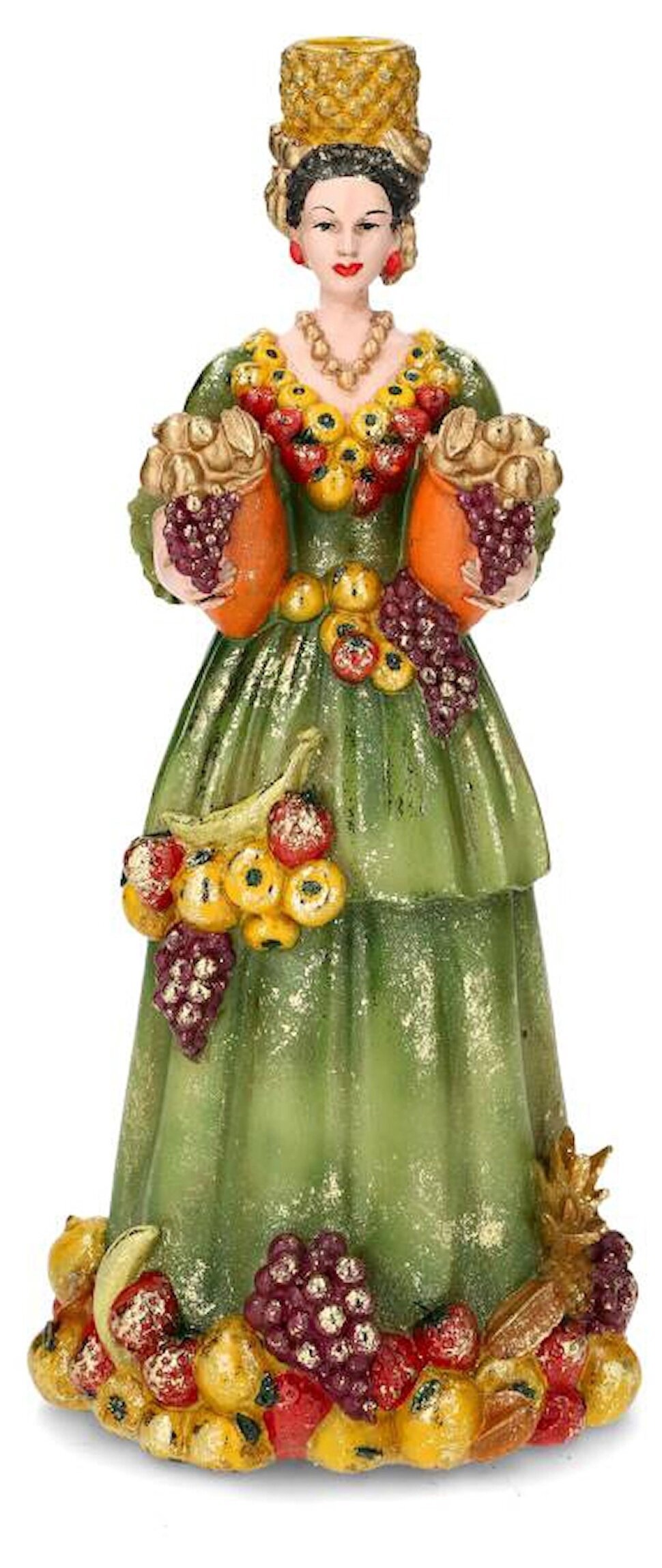 En färgstark och dekorativ ljusstake formad som en elegant kvinna klädd i en grön klänning, rikt utsmyckad med frukter i varma, levande toner. De vackra detaljerna och den glittrande finishen ger ett exklusivt och lekfullt uttryck som direkt drar blickarna till sig.