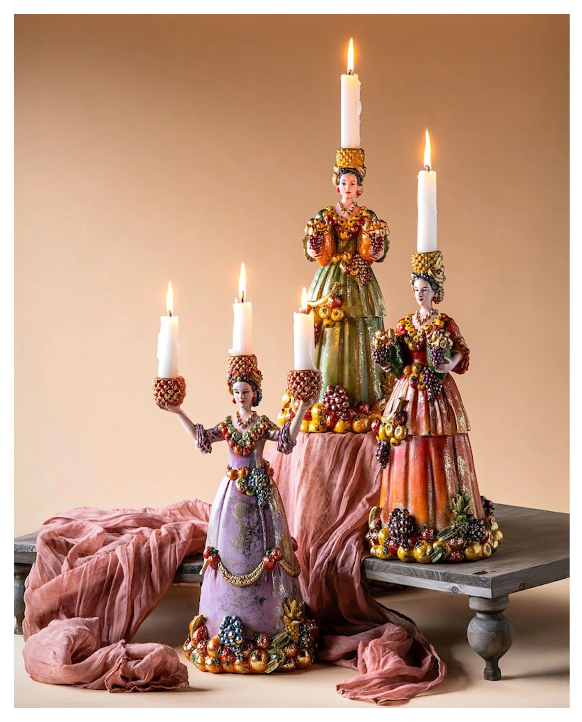En färgstark och dekorativ ljusstake formad som en elegant kvinna klädd i en röd klänning, rikt utsmyckad med frukter i varma, levande toner. De vackra detaljerna och den glittrande finishen ger ett exklusivt och lekfullt uttryck som direkt drar blickarna till sig.
