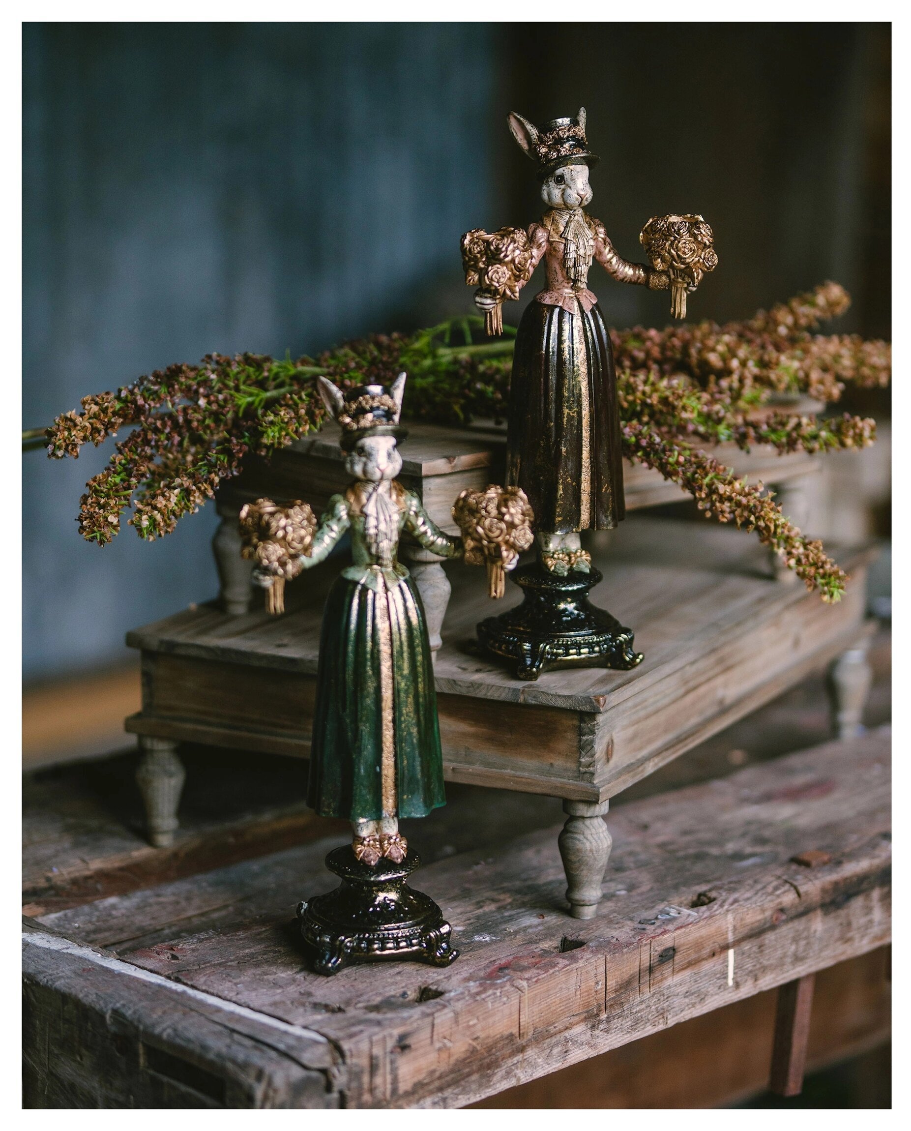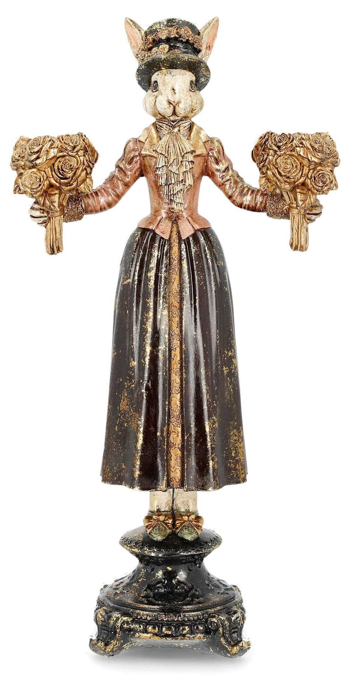 Charmig ljusstake som blir ett vackert blickfång året runt. Den dekorativa kaninfiguren är klädd i eleganta detaljer och håller två buketter som skapar en lyxig och romantisk känsla. Med sina antika färger och fina mönster passar den lika bra på matbordet som i fönstret eller på en sideboard.