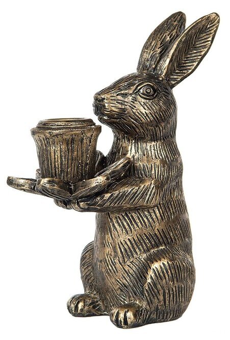 Figuren står upprätt på sina bakben, vilket ger en känsla av både balans och nyfikenhet. I sina framtassar håller haren en hållare avsedd för ljus, vars design liknar en enkel bägare eller urna som är något bredare upptill. Ljushållaren, vars yta är randig, smälter väl samman med harens övergripande detaljer och färgschema, vilket förstärker den estetiska enhetligheten.