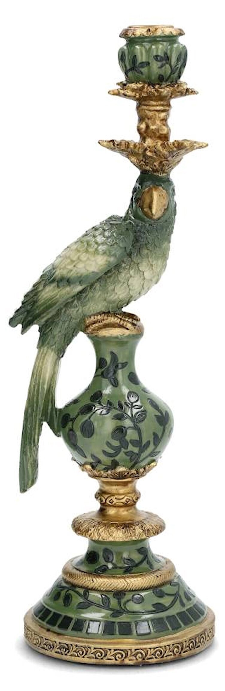 En elegant ljusstake med vacker papegoja som ger hemmet en charmig och exklusiv känsla. De handmålade detaljerna i grönt och guld skapar ett lyxigt uttryck, och den klassiska formen gör den lika dekorativ med eller utan ljus. Placera den på ett sidobord, i fönstret eller som en del av en vacker dukning - den blir alltid ett blickfång.