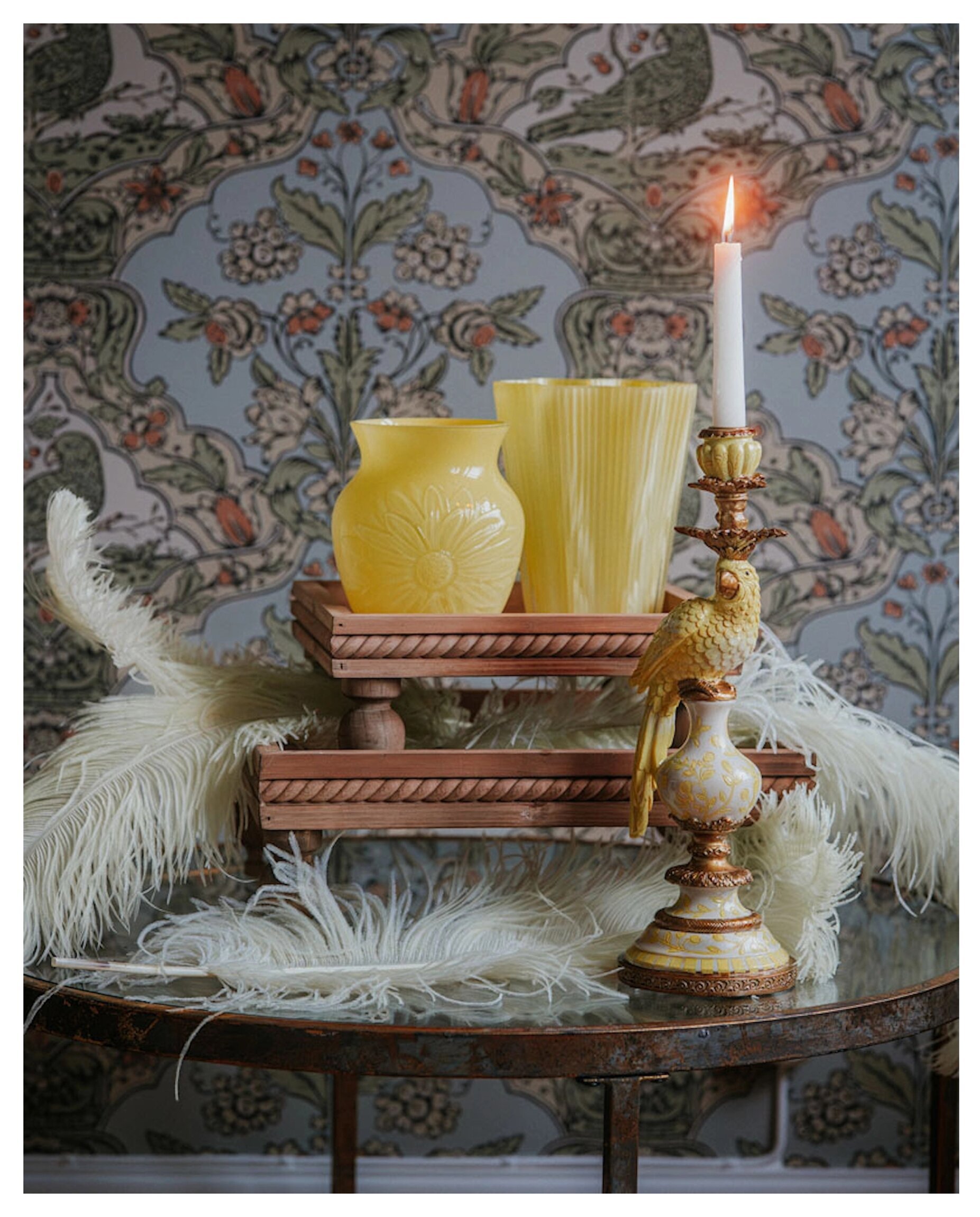 Den gula tonen skapar en varm känsla och gör ljusstaken till ett fint blickfång i rummet – perfekt på ett sideboard, i bokhyllan eller som en personlig detalj på det dukade bordet.