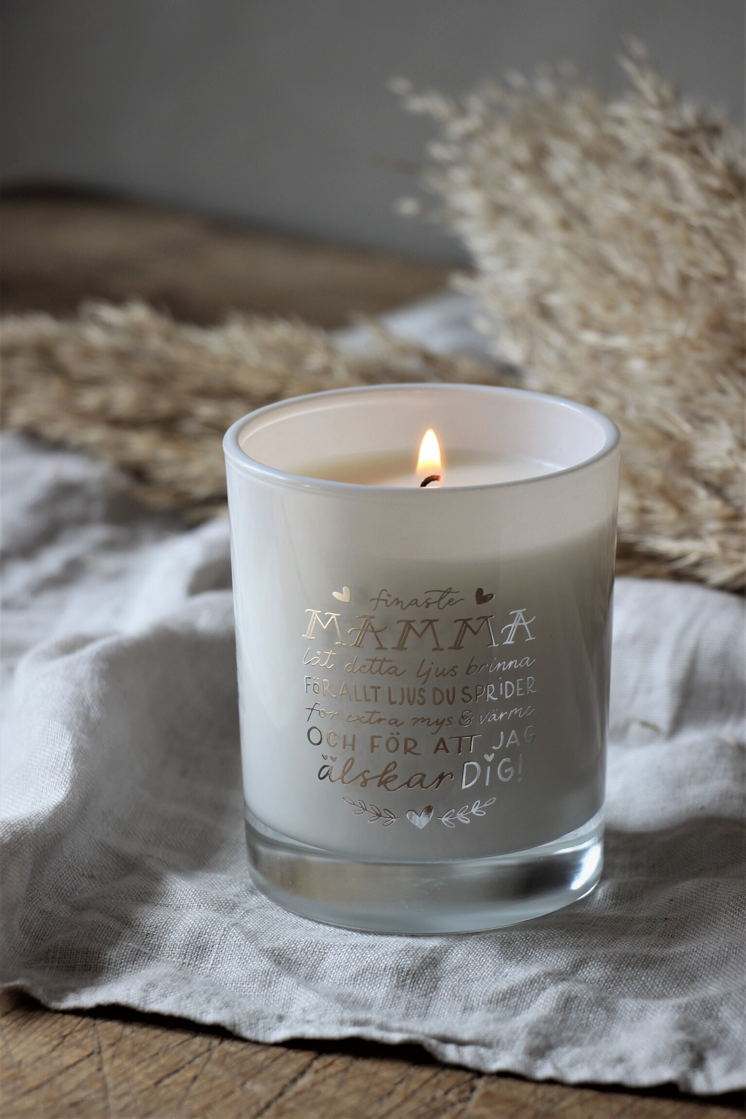 Ljuset är inneslutet i en stilren glasbehållare med en mjuk vit nyans. Glasets yta är slät, och ett varmt sken strålar från lågan som brinner lugnt. På lykta finns en inskription med dekorativa bokstäver i guld och silver, och dessa nyanser reflekterar ljuset, vilket ger texten en subtil glans. Texten, riktad till en mamma, är kärleksfullt formulerad med små hjärtan och delikata blommönster som förstärker det personliga meddelandet.