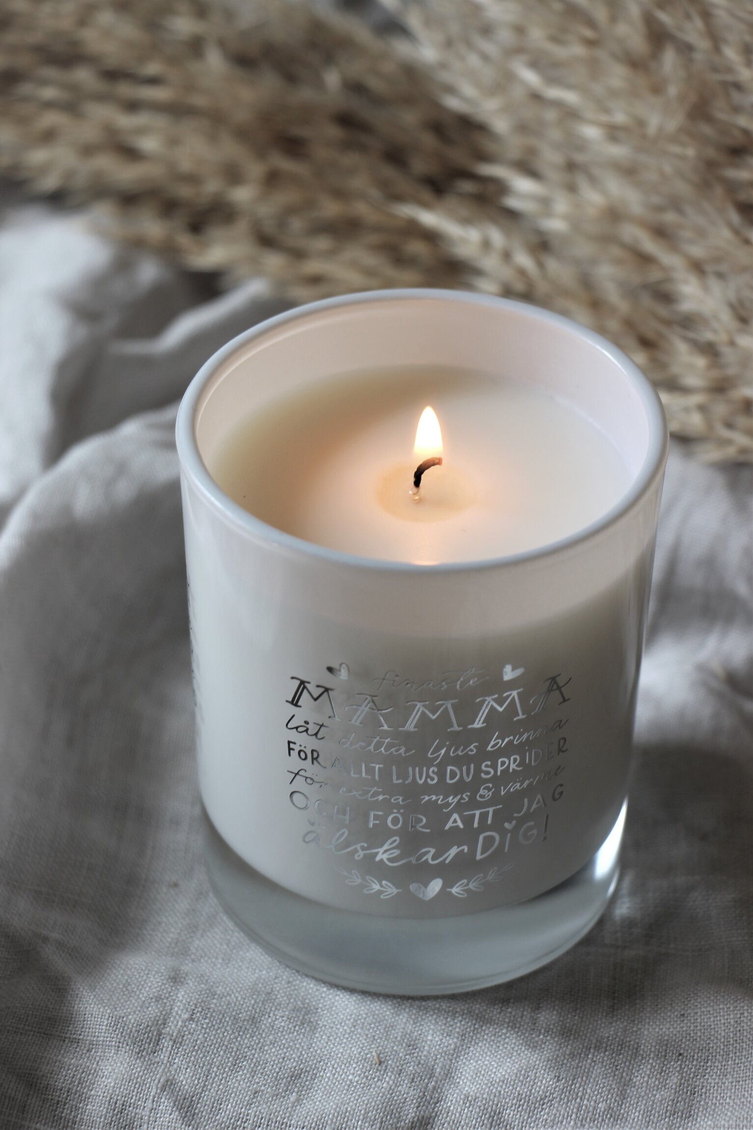 Ljus i vit finish med silvertext om Mamma från Majas Cottage. Brinntid ca 40 timmar. Blyfri bomullsveke.