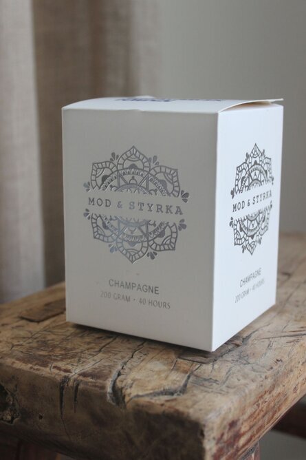 Längst ner på förpackningen finns information om doften "Champagne", samt detaljer kring produktens vikt, som är 200 gram, och brinntiden, som uppges till 40 timmar. Texten är i en enkel, lättläst font som harmoniserar med den övergripande designen.