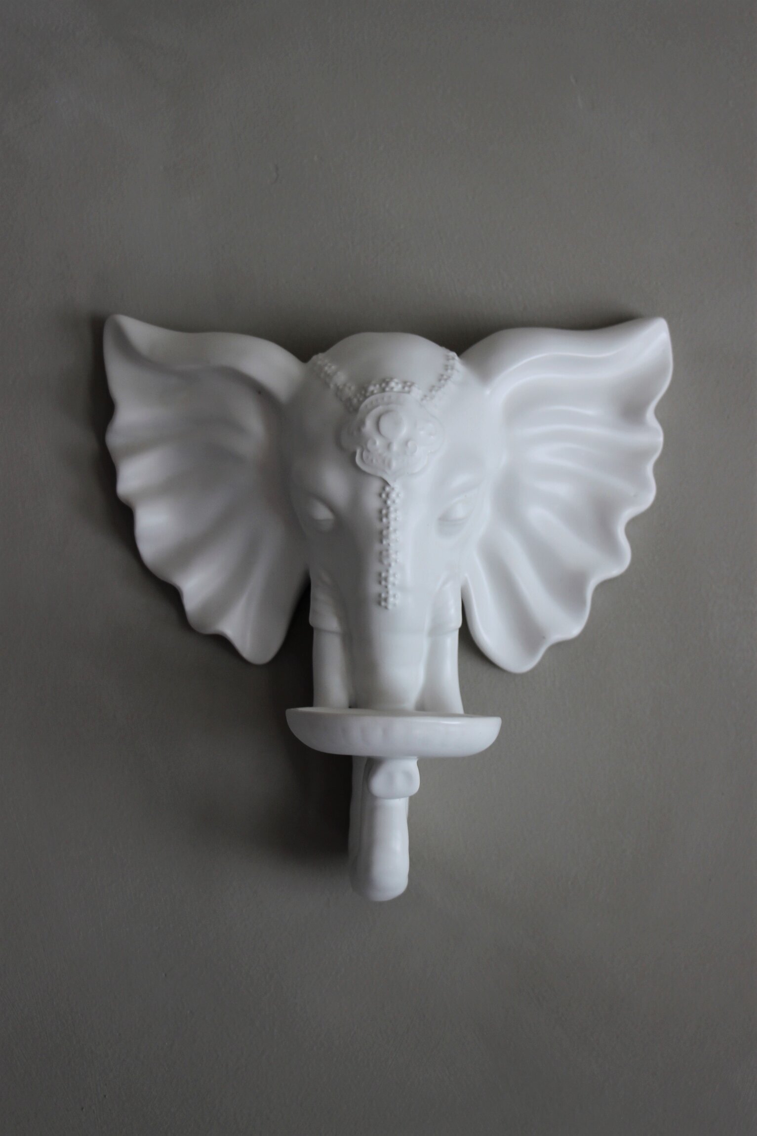 Den neutrala färgskalan i kombination med de mjuka, organiska linjerna gör den här ljushållaren till ett mångsidigt alternativ för olika inredningsstilar. På väggen skapar elefantens motiv en iögonfallande punkt samtidigt som den vitglänsande ytan reflekterar ljus på ett subtilt sätt. Ljushållaren är inte bara funktionell utan tjänar även som ett dekorativt objekt som kan bli ett samtalsämne i hemmet.