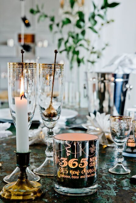 Vacker ljuslykta med texten: 365 Days New Days, 365 New Chances, Embrace, Enjoy And Own Them. Lyktan har en silvrig finish med matt vit insida.