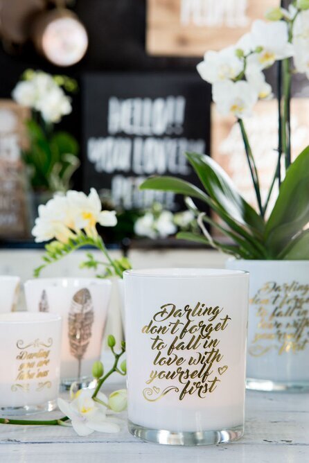 Ljuslykta med text i 100% bladguld. Vattentålig men ska dock ej diskas i maskin. Ljuslyktan har texten: Darling, Dont Forget To Fall In Love With Yourself First.