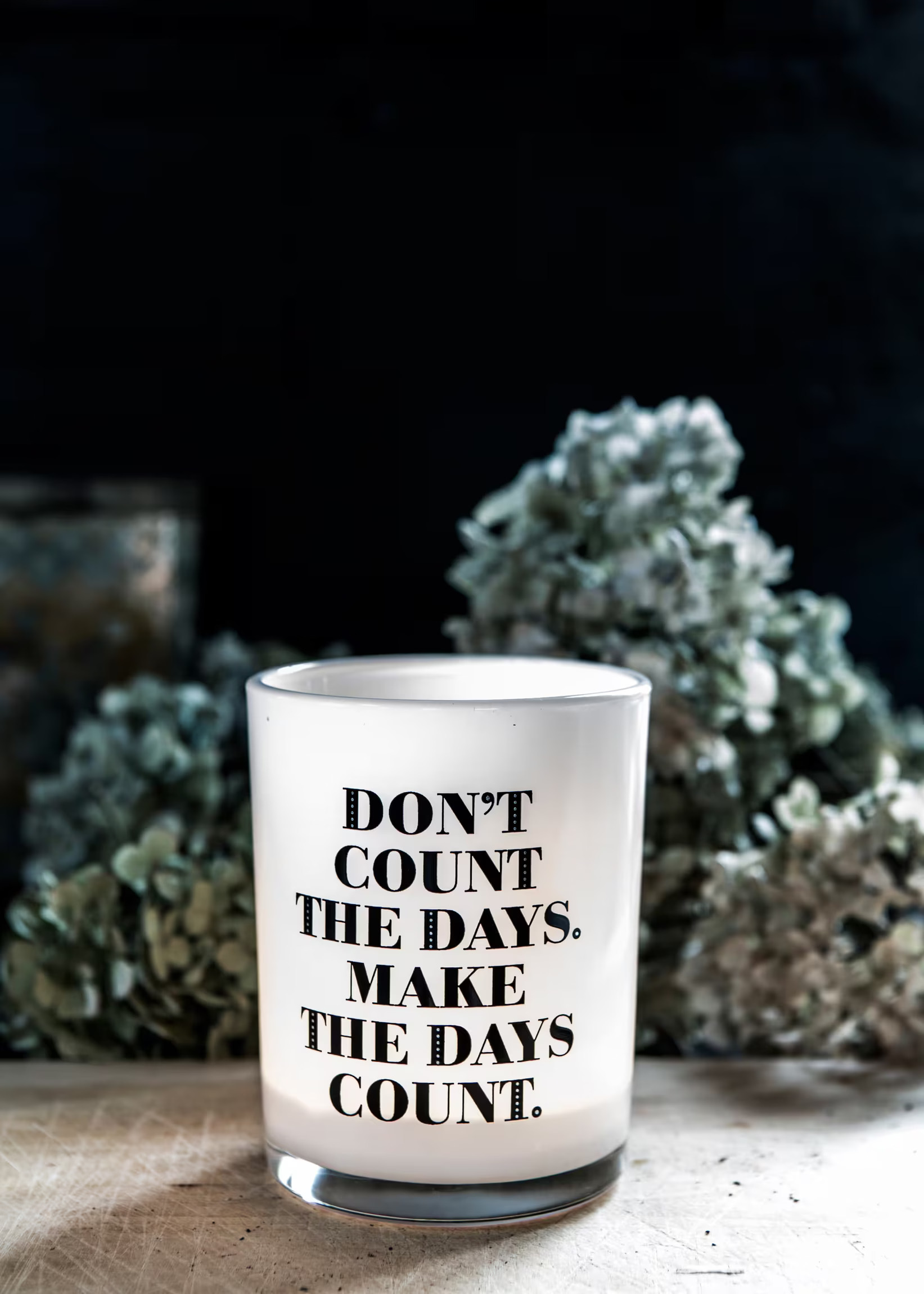 Centralt på ljuslyktan syns en text i svart typsnitt som står ut mot det matta glaset: "Don't count the days. Make the days count." Texten fångar ögat direkt och ger lyktan ett budskapsdrivet uttryck, vilket kan tilltala den som söker både funktion och ett meningsbärande element i sitt hem. Textens placering och typografi balanserar väl på den vita bakgrunden och bidrar till både stil och eftertanke.