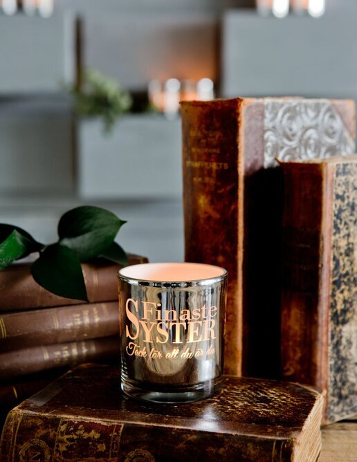 Ljuslyktan i silverfärgad finish reflekterar ljuset på ett subtilt sätt och fångar ögat med sitt framträdande utseende. Dess blanka yta speglar omgivningen och ger en känsla av rymd och reflektion. Den moderna designen på lyktan är i kontrast med de antika böckerna och skapar en harmonisk balans mellan gammalt och nytt. På lyktan står det "Finaste Syster" i stilfull text, vilket förstärker känslan av omsorg och omtanke, medan den underliggande inskriptionen “Tack för att du är du” är tydligt och kärleksfullt framhävd.