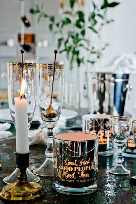 På bilden syns ett elegant dukat bord hos Ljuslyktor.nu, en butik som specialiserar sig på ett brett sortiment av ljuslyktor med fokus på design och ljuskvalitet. I förgrunden är produkten "Good Times - Silver" från varumärket Majas Cottage tydligt framträdande. Denna ljuslykta pryds av inskriptioner med texten "Good Food, Good People, Good Times", vilket förstärker intrycket av en inbjudande och gemytlig atmosfär.
