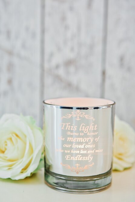 På glasets främre del finns en ingraverad text i en diskret men elegant skrivstil. Texten lyder: "This light burns to honor the memory of our loved ones who we have lost and miss endlessly", och är utformad med ett dekorativt mönster runtom. Den graverade texten ger lyktan en betydelsefull och personlig dimension, vilket kan attrahera de som söker en ljuskälla med djupare innebörd.