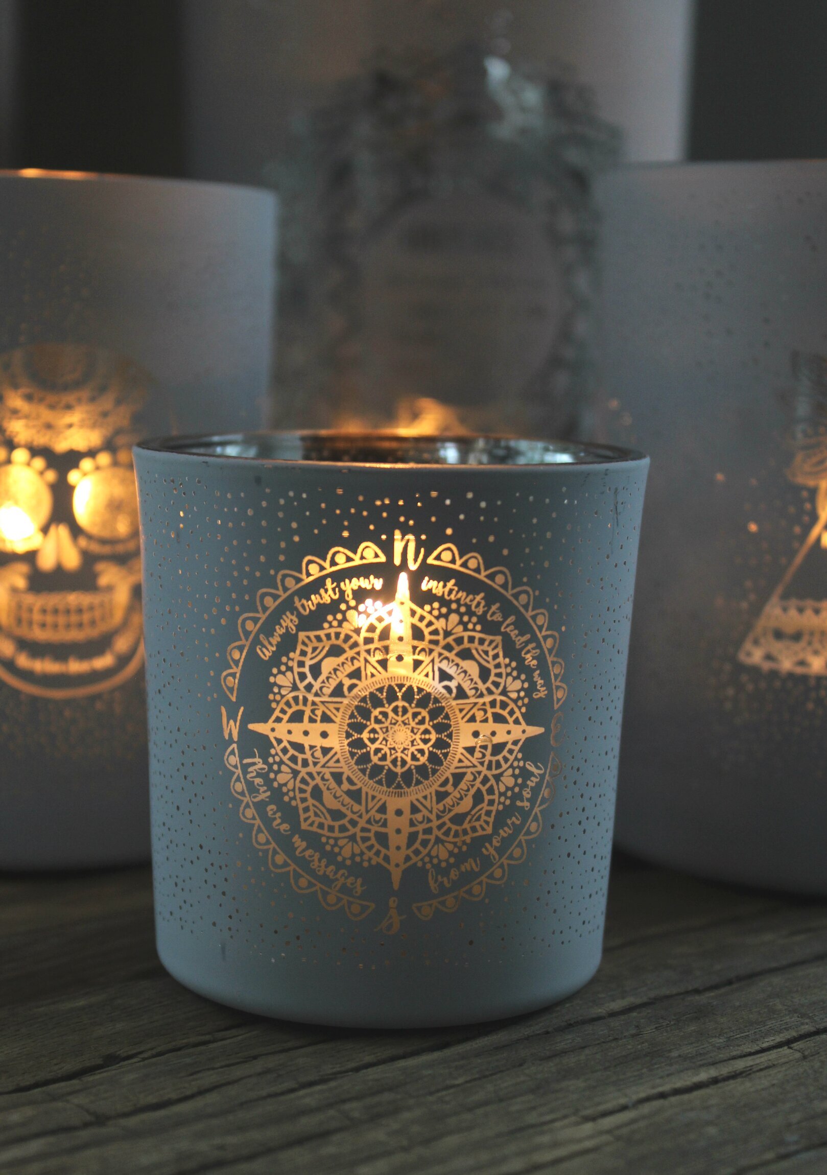 I förgrunden ser vi en lykta med en cirkulär kompassdesign, där linjer och former bildar ett mönster med olika ornament. Mönstret döljt i lyktans genomskinliga yta ger ett hypnotiserande intryck, vilket förstärks av det gyllene ljusskenet inifrån. Den här lyktan, som man finner hos Ljuslyktor.nu, har en yta dekorerad med prickar som sträcker sig över hela dess kropp, vilket skapar en känsla av rörelse och liv.