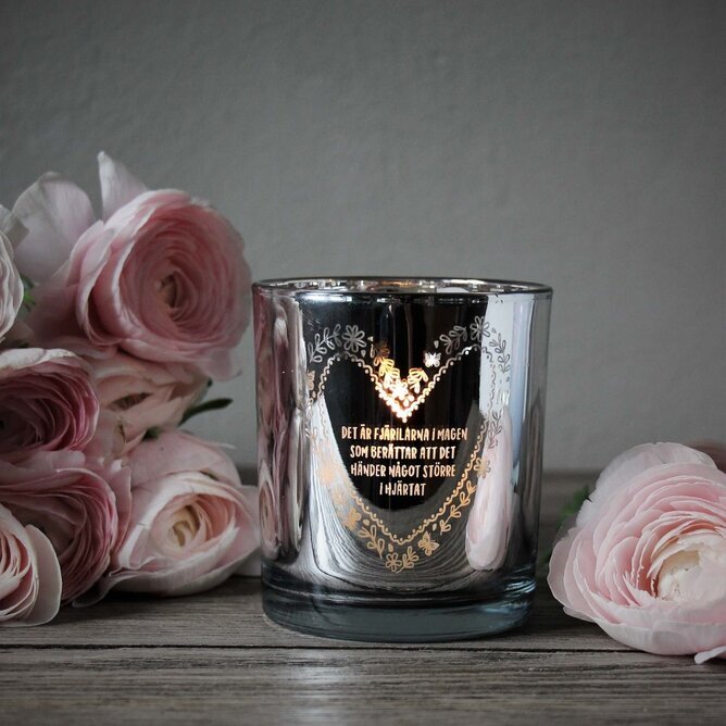 Vacker ljuslykta i silver från Majas Cottage med texten - Det är fjärilarna i magen som berättar att det händer något större i hjärtat.