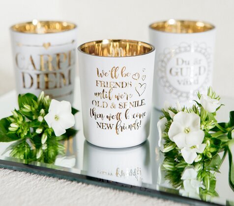 Vacker ljuslykta från Majas Cottage i vit finish med guldfärgad insida. Text: Friends.